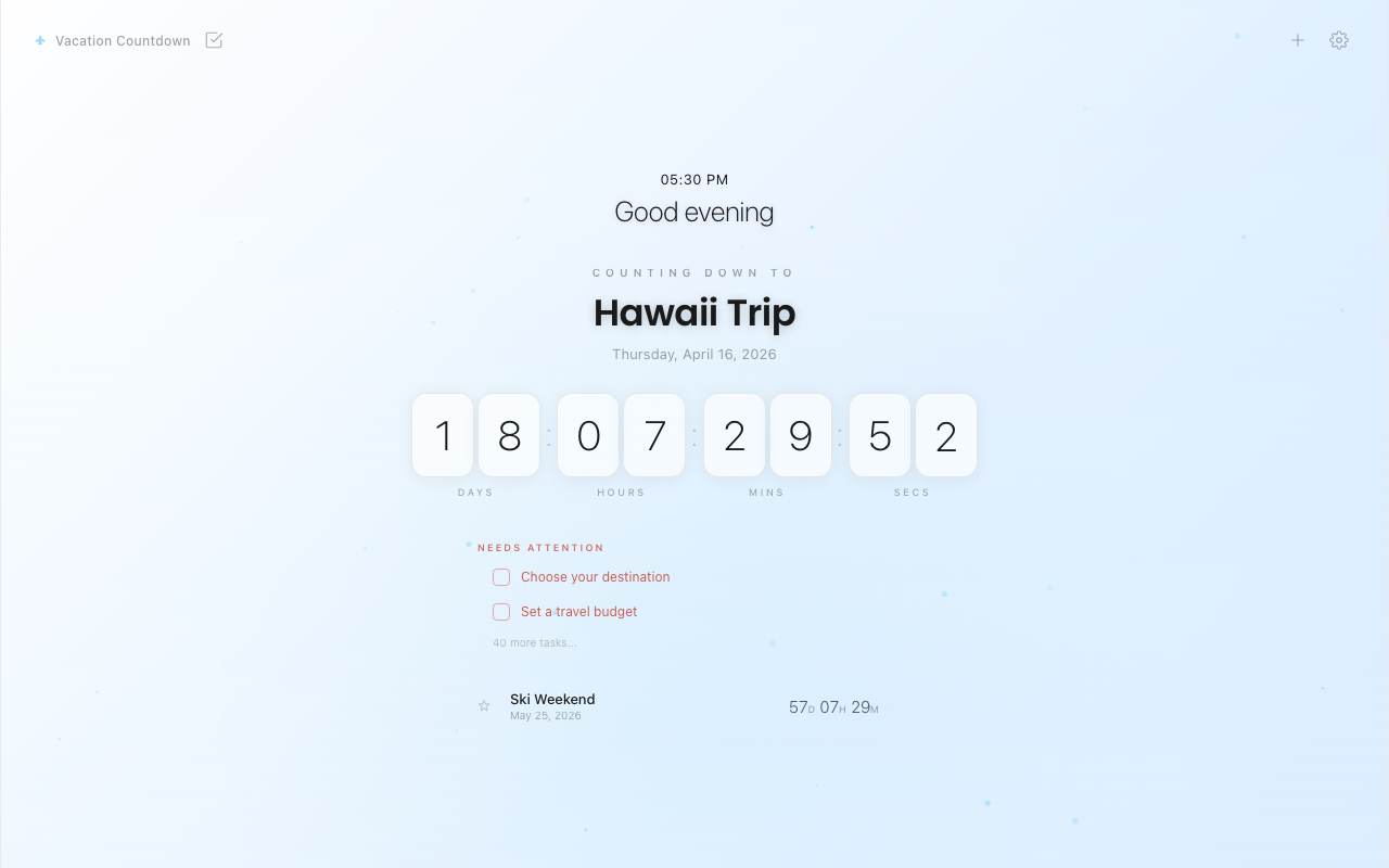 Beautiful new-tab countdown extensions for Chrome. 5 timer styles, curated backgrounds, zero ads.